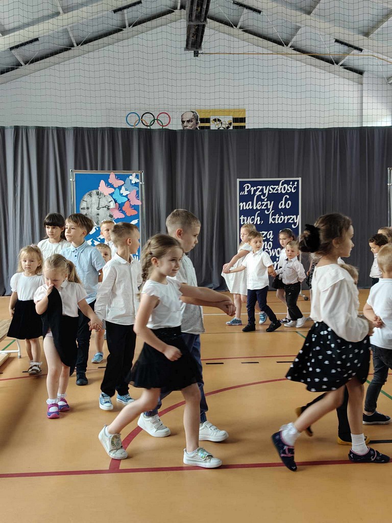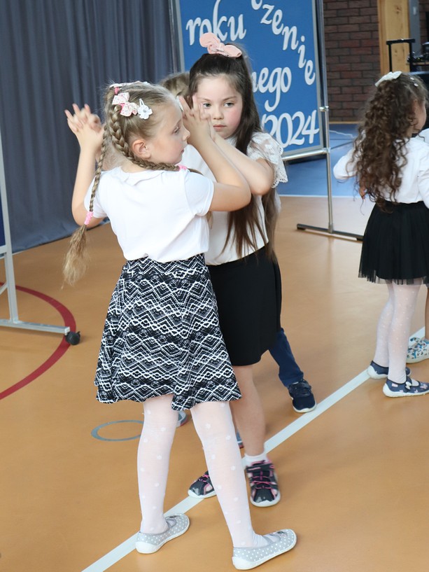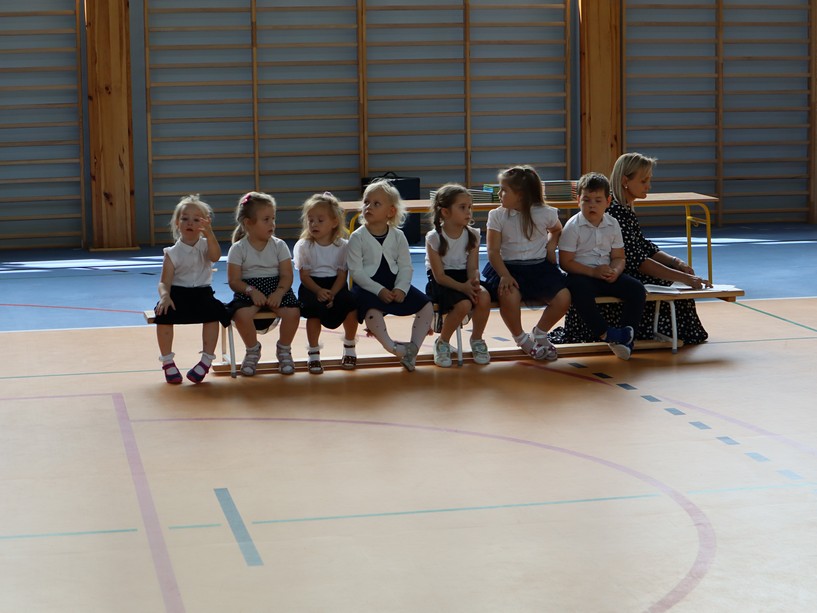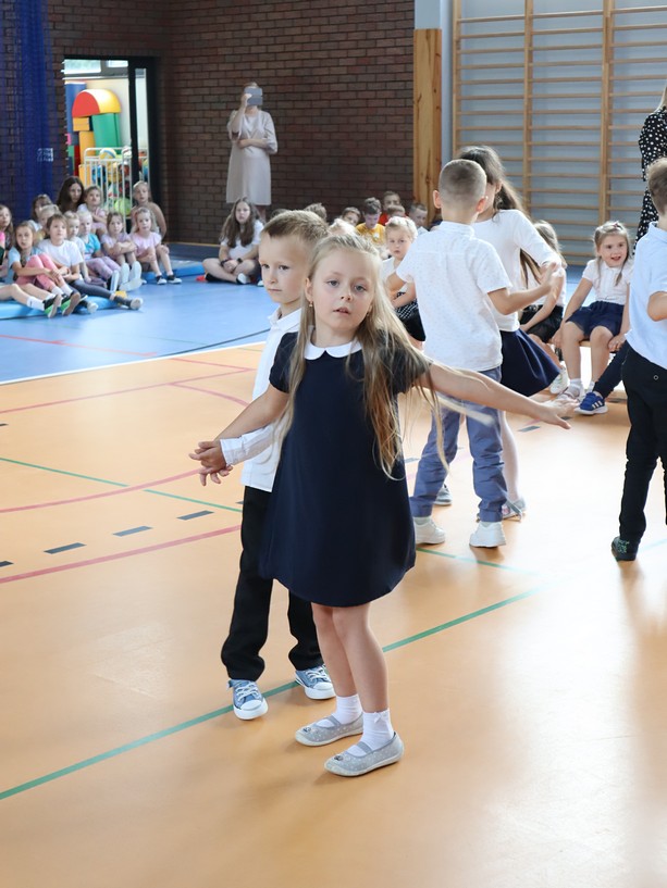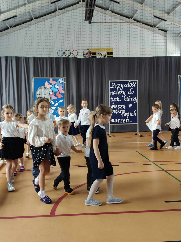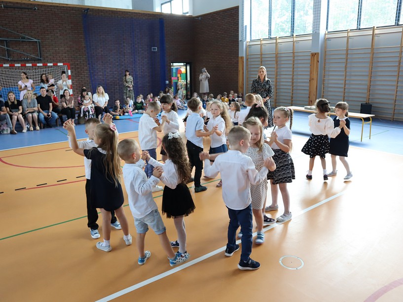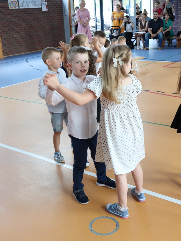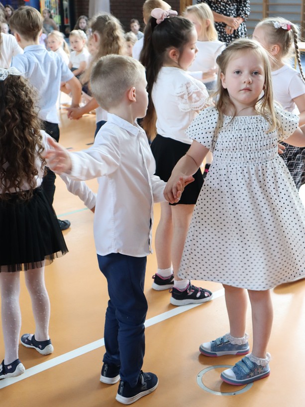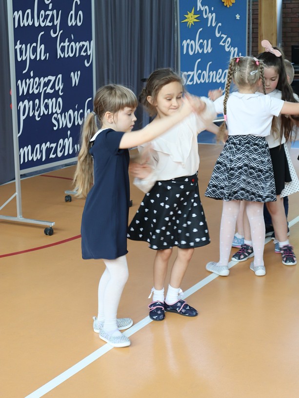 Dzieci rozpoczęły pięknym polonezem, który składał się z wielu elementów. Następnie nadszedł czas na wiersze, piosenki i tańce. Zgromadzeni rodzice, nauczyciele i koledzy z klas 1-3 z uśmiechem obserwowali popisy najmłodszych i nagradzali je wielkimi brawami. Pani Dyrektor Halina Toboła zwróciła uwagę na wspaniałą współpracę między przedszkolem i zerówką oraz świetne zgranie w tańcu.