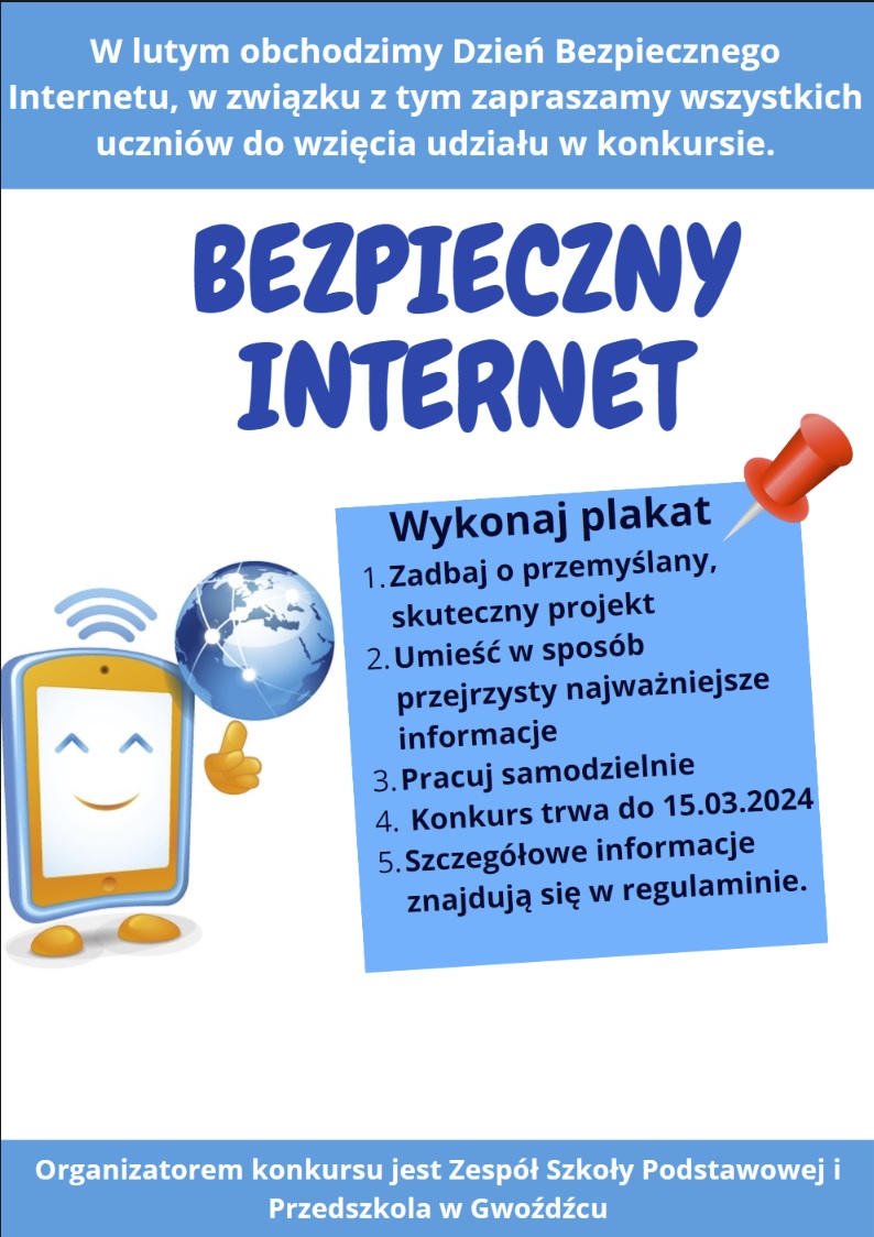 Podczas ferii zachęcamy do przygotowania plakatu, by wziąć udział w konkursie zorganizowanym z okazji Dnia Bezpiecznego Internetu. Szczegóły w regulaminie.