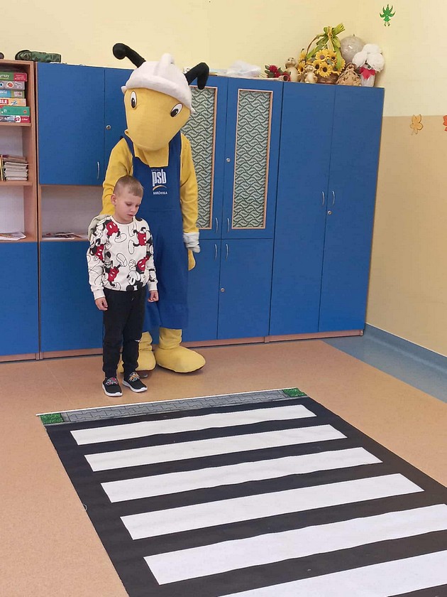 Przedstawiciel sklepu PSB ,,Mrówka” wręczył nam drobne upominki - odblaski oraz kamizelki odblaskowe. Na koniec zrobiliśmy sobie pamiątkowe zdjęcie. Spotkanie było bardzo pouczające i ciekawe!