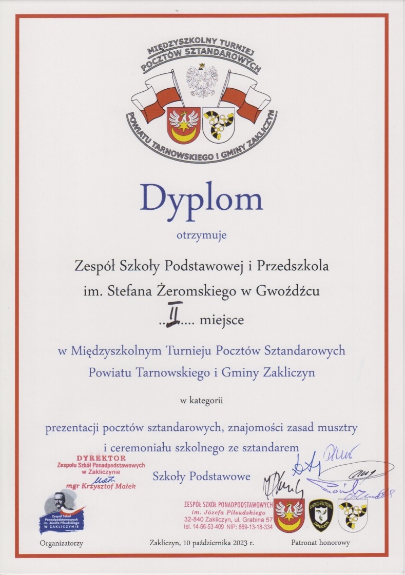 Jacek Łośko 11 październik 2023 Odsłony: 766 Dyplom za II miejsce w Międzyszkolnym Turnieju Pocztów Sztandarowych