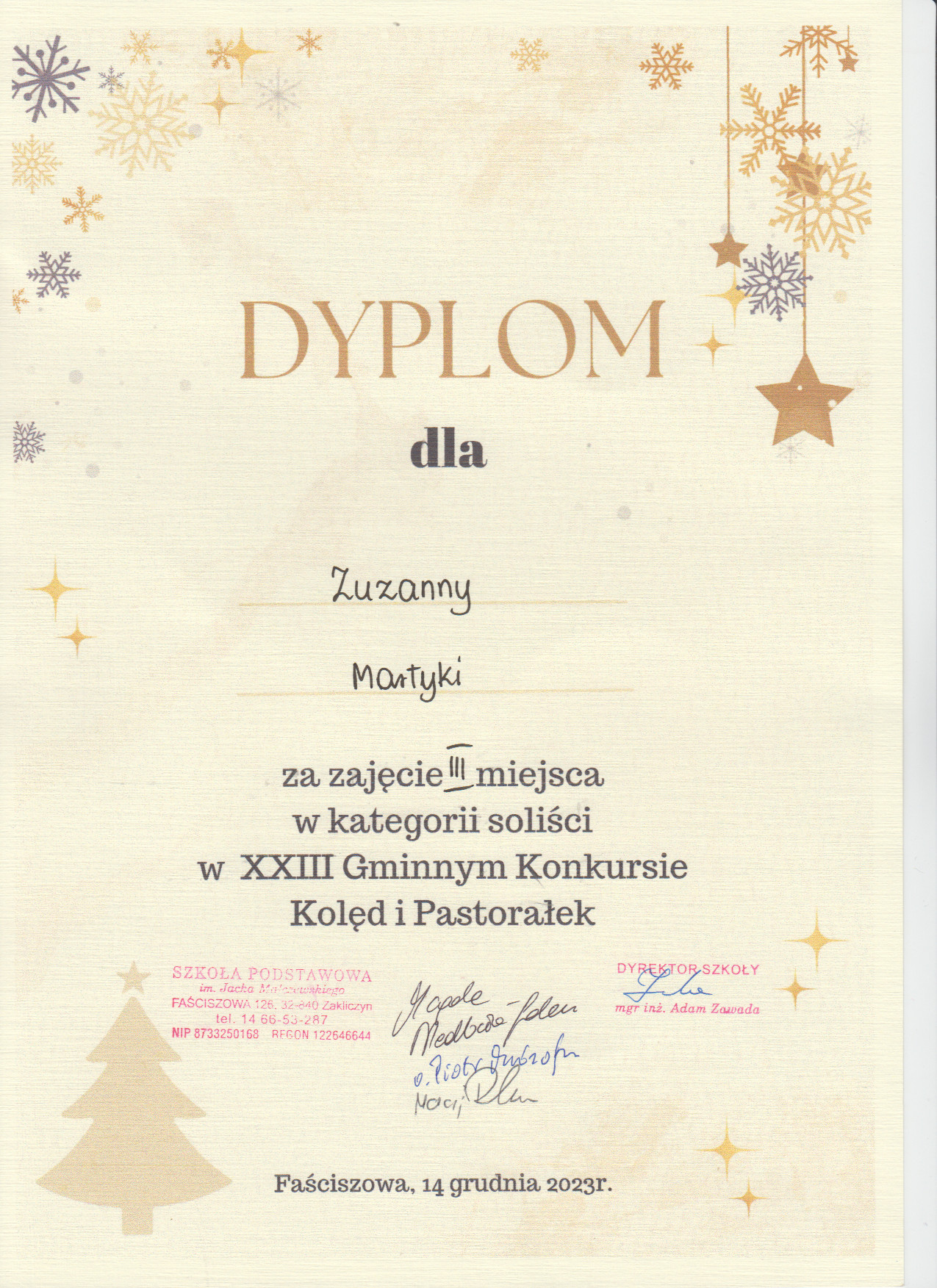 Magdalena Migdał 15 grudzień 2023 Odsłony: 689 Dyplom dla Zuzi Martyki za zajęcie III miejsca w kategorii soliści w XXIII Gminnym Konkursie Kolęd i Pastorałek