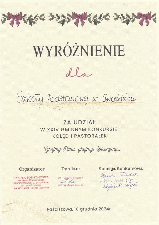 Magdalena Migdał 11 grudzień 2024 Odsłony: 609 Wyróżnienie za udział w XXIV Gminnym Konkursie Kolęd i Pastorałek