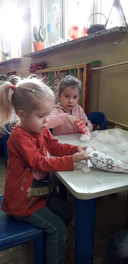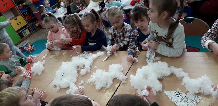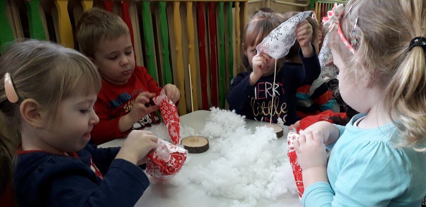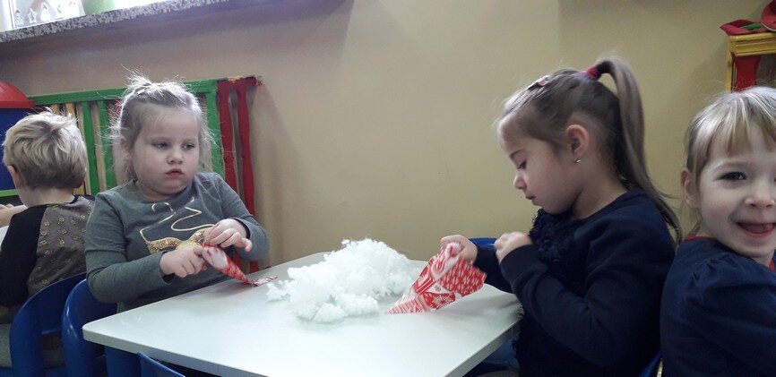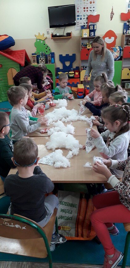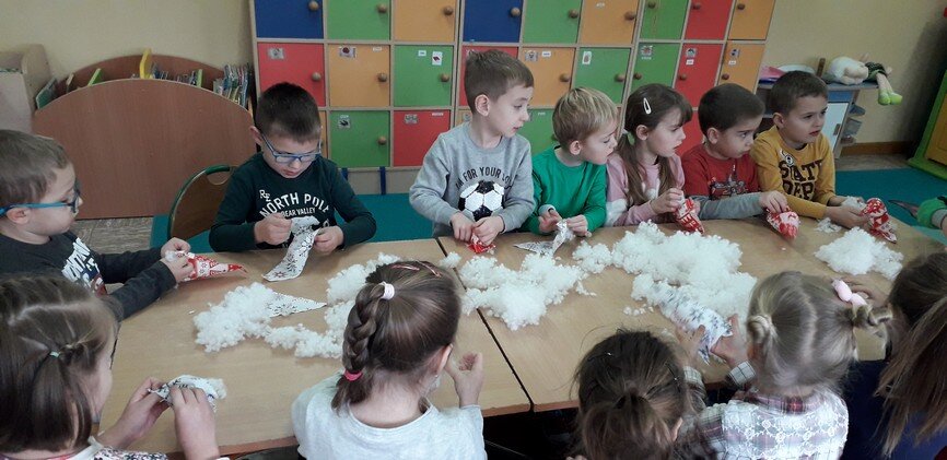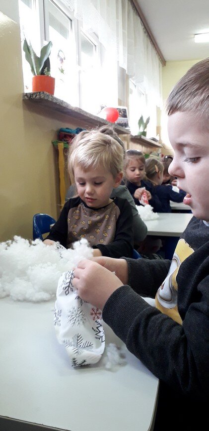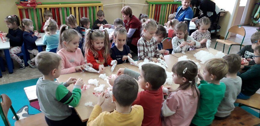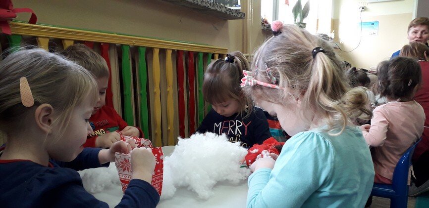 Mimo ciężkiej pracy, którą trzeba było wykonać, aby napełnić choineczkę pluszem, wszystkie przedszkolaki dzielnie pracowały. Niezbędne materiały do ich wykonania otrzymaliśmy od pani Gosi, za co bardzo serdecznie dziękujemy.