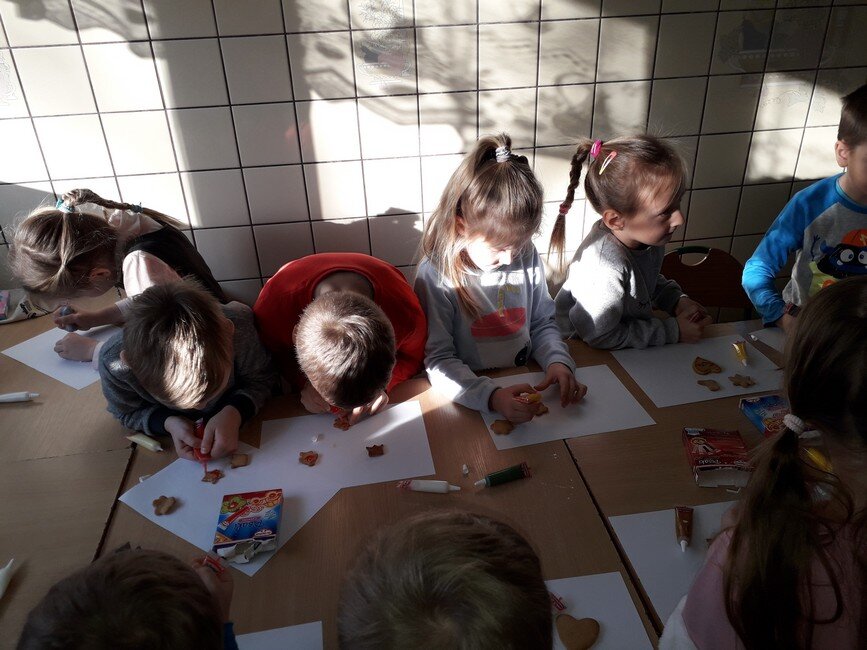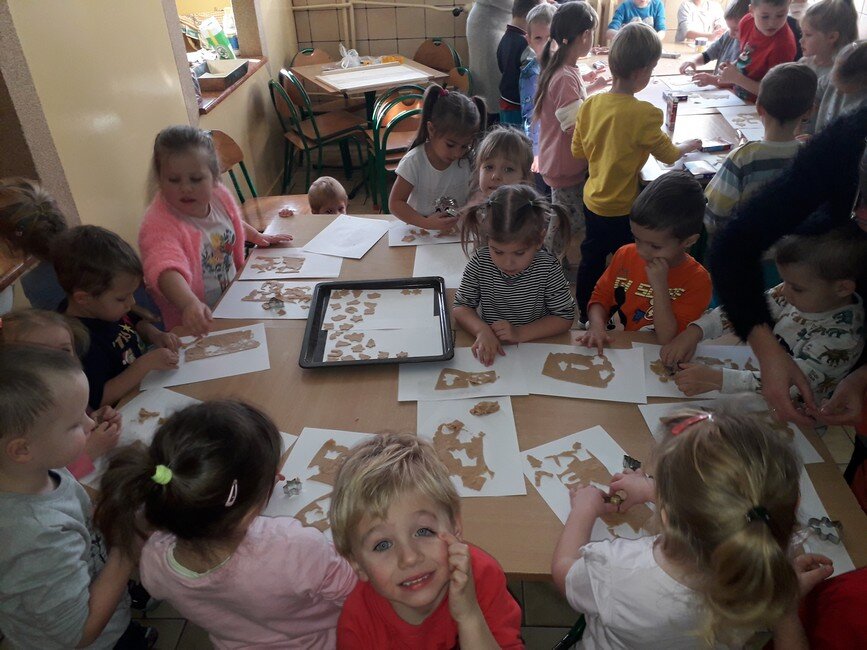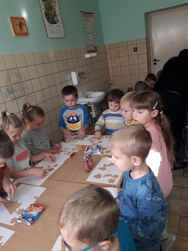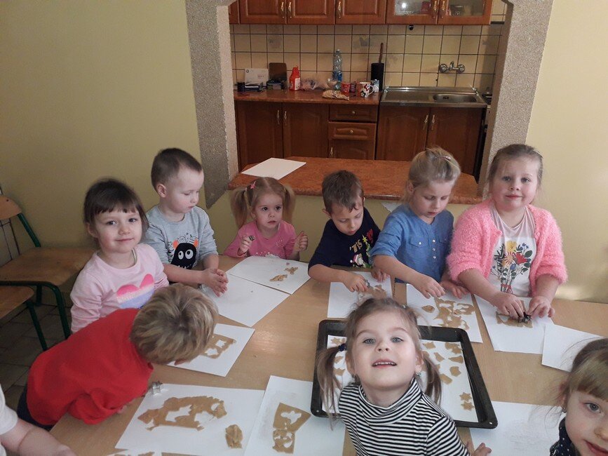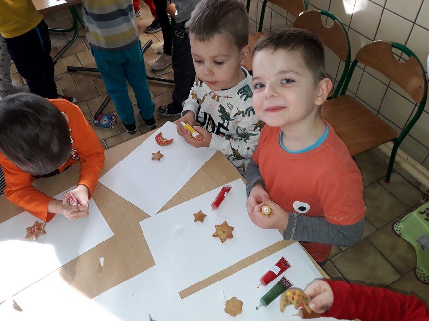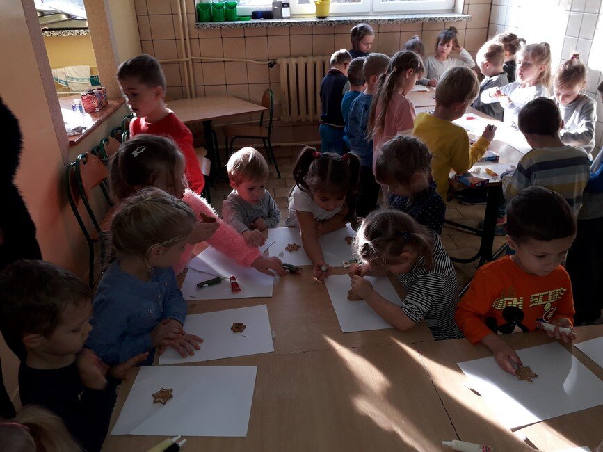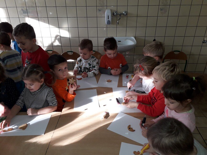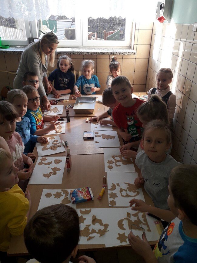 W drugim tygodniu grudnia dzieci z przedszkola i oddziału przedszkolnego, zgodnie z przedświąteczną tradycją upiekły pyszne pierniczki. Z pomocą pań praca z przygotowaniem wypieków szła sprawnie i bez trudu. Wszystkim podobało się wykrawanie świątecznych kształtów - gwiazdek, dzwoneczków, aniołków, choinek za pomocą foremek.