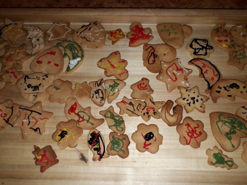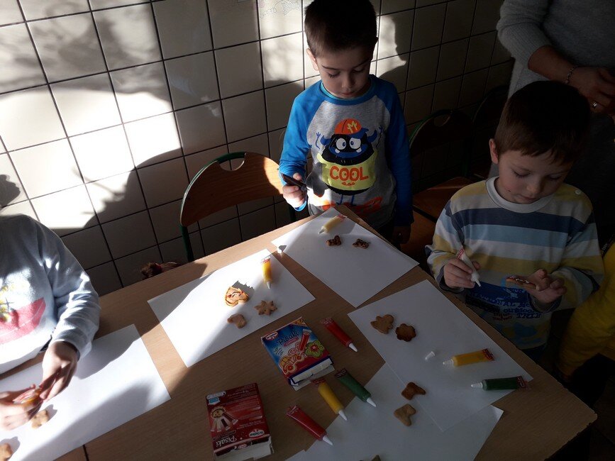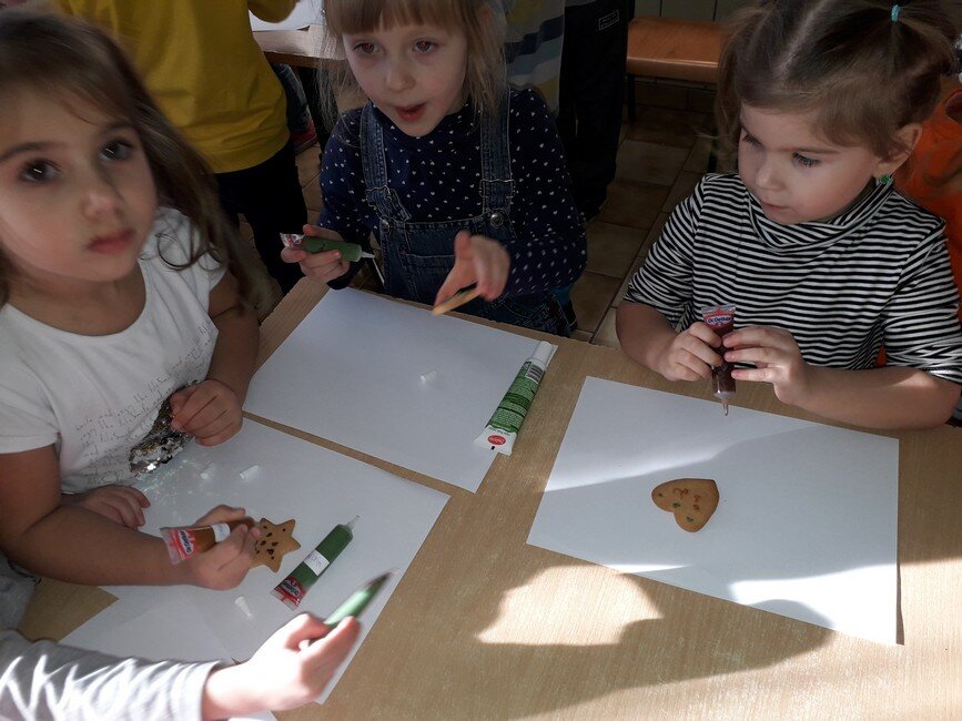 Po upieczeniu pierników dzieci przystąpiły do ich dekorowania lukrowymi pisakami i barwnymi posypkami. Zabawa była doskonała a pierniczki wyszły przepiękne.