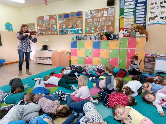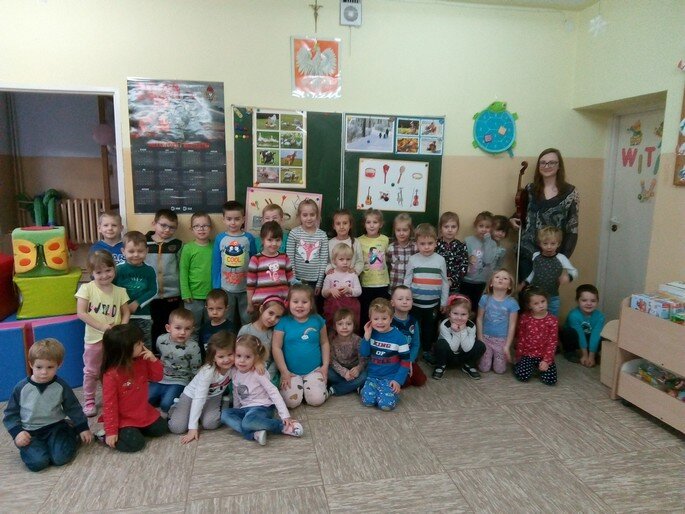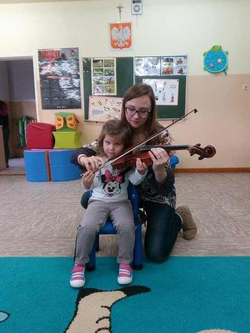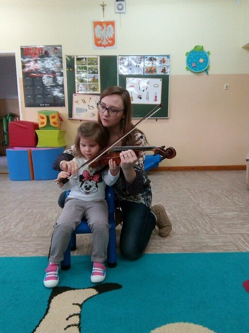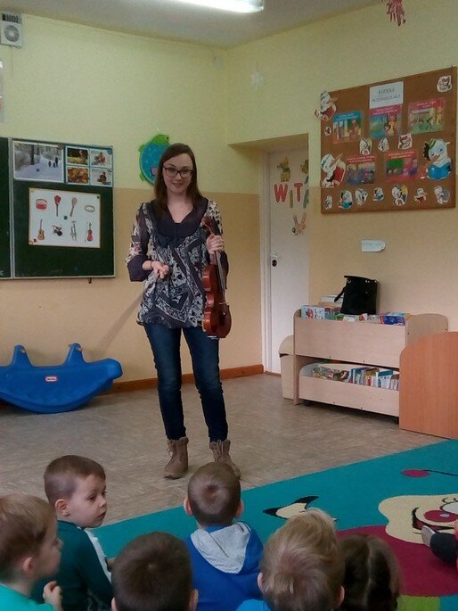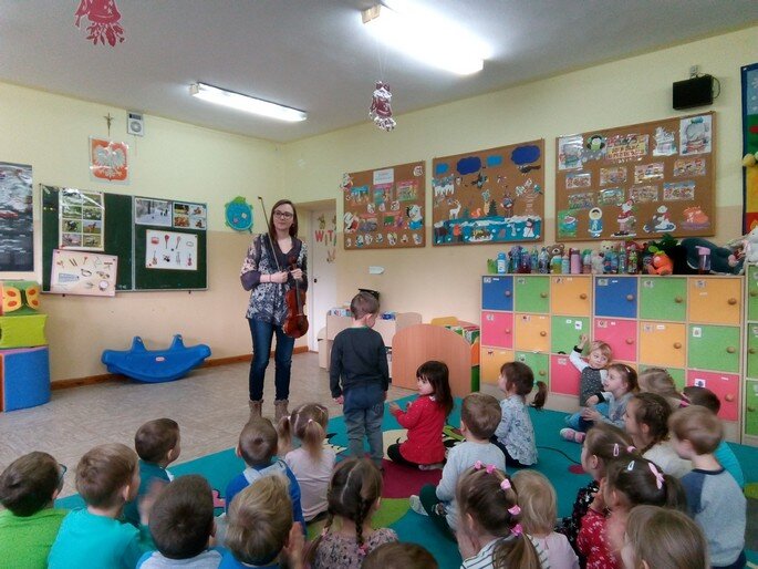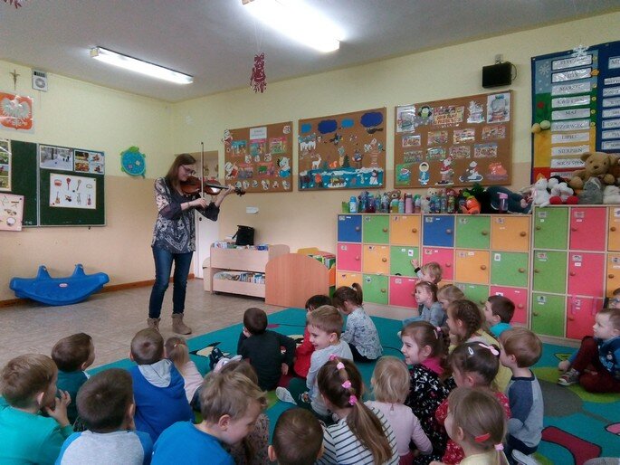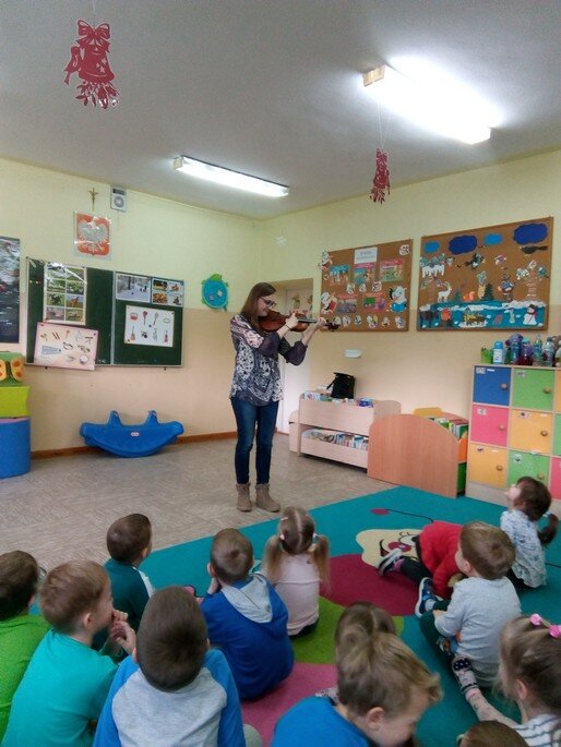 21 lutego odwiedziła nas w przedszkolu mama naszego kolegi Tymka, która jest skrzypaczką. Spotkanie to zostało zorganizowane w związku z realizowanym tematem tygodnia "Muzyka wokół nas" oraz projektem realizowanych wspólnie z oddziałem przedszkolnym dotyczącym poznawania zawodów naszych najbliższych członków rodziny. Prezentacja skrzypiec oraz muzyczny koncert sprawił przedszkolakom wiele radości, dzieci wysłuchały m.in utworów, które na co dzień śpiewają w przedszkolu.