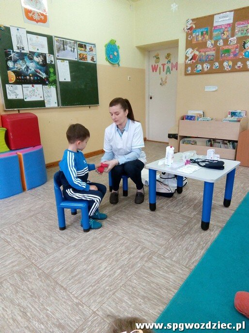 26 lutego naszym gościem w przedszkolu była pani Basia - mama Artura z oddziału przedszkolnego. Pani Basia jest pielęgniarka i nie jest to jej pierwsza wizyta w naszych progach. Podczas tego spotkania dzieci miały okazję dowiedzieć się więcej o trudnym zawodzie pielęgniarki, pokonać lęk przed zabiegami medycznymi, a przede wszystkim wzbogacić i utrwalić swoje wiadomości na temat sposobów dbania o zdrowie. Pani Basia pokazała nam proste zabiegi medyczne - założenie opatrunku, mierzenie temperatury, każdy mógł posłuchać bicia swojego serduszka przez stetoskop, uczyła nas także zasad prawidłowego mycia rączek. Nasz gość przygotował dla dzieci prezenty - kolorowe plasterki. Na zakończenie wizyty przedszkolaki podarowały pani Basi pamiątkowy dyplom z podziękowaniami. Dziękujemy za bardzo miłe spotkanie oraz profesjonalne przygotowanie i przeprowadzenie zajęć.